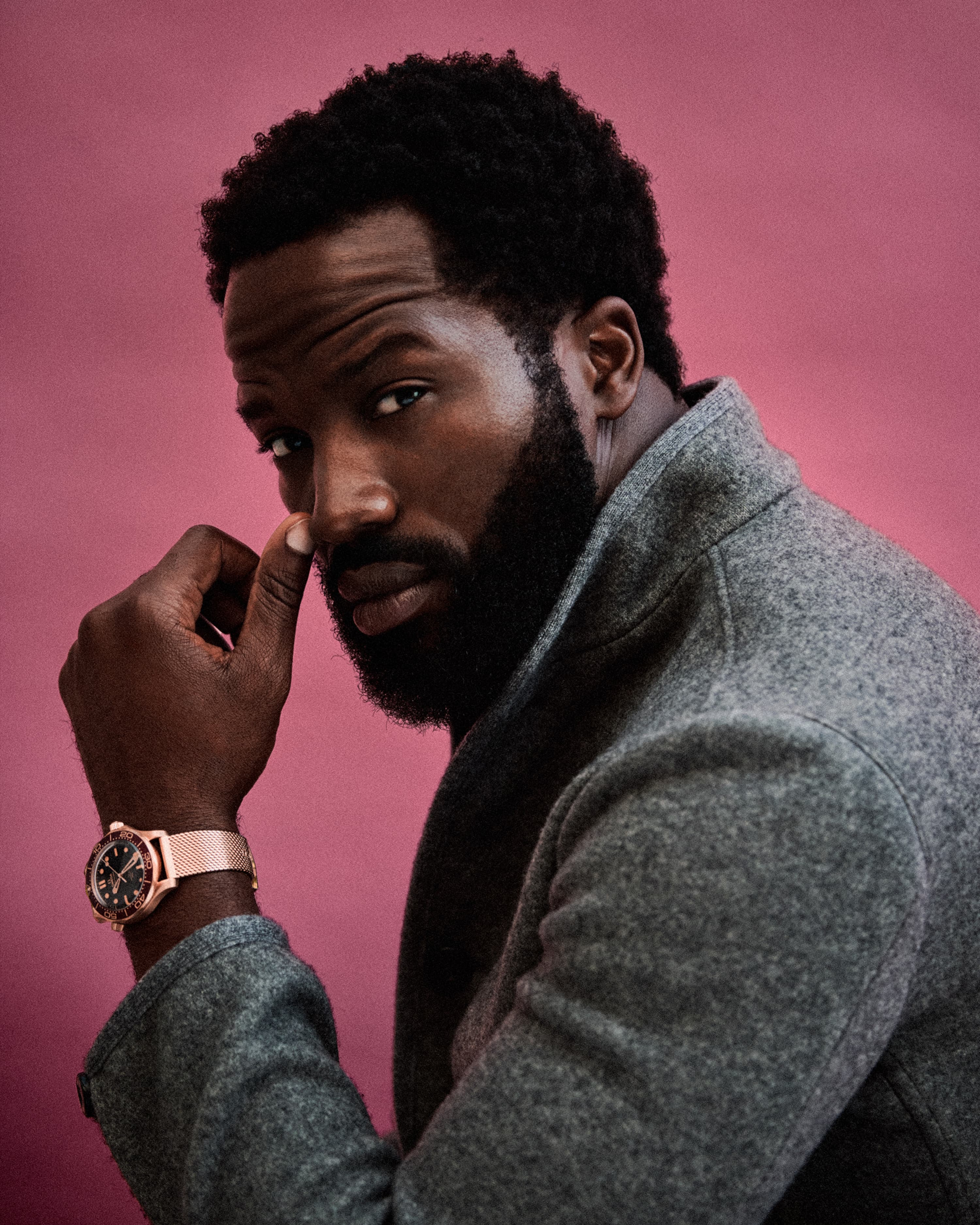 Ṣọpẹ́ wears jacket Zegna; timepiece Omega